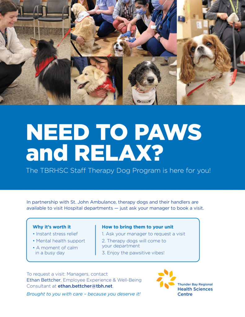 In partnership with St. John Ambulance, therapy dogs and their handlers are available to visit Hospital departments — just ask your manager to book a visit. See the poster below for more details.