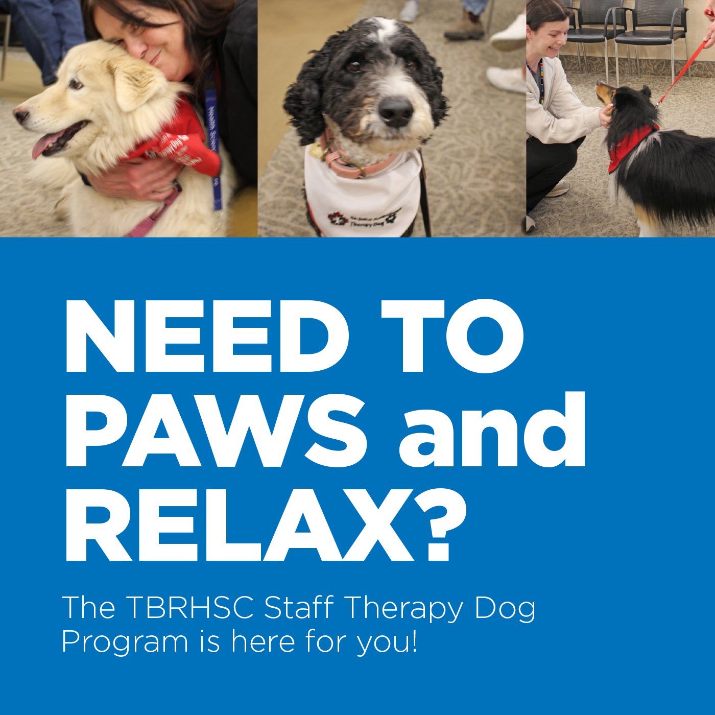 In partnership with St. John Ambulance, therapy dogs and their handlers are available to visit Hospital departments — just ask your manager to book a visit. See the poster below for more details.