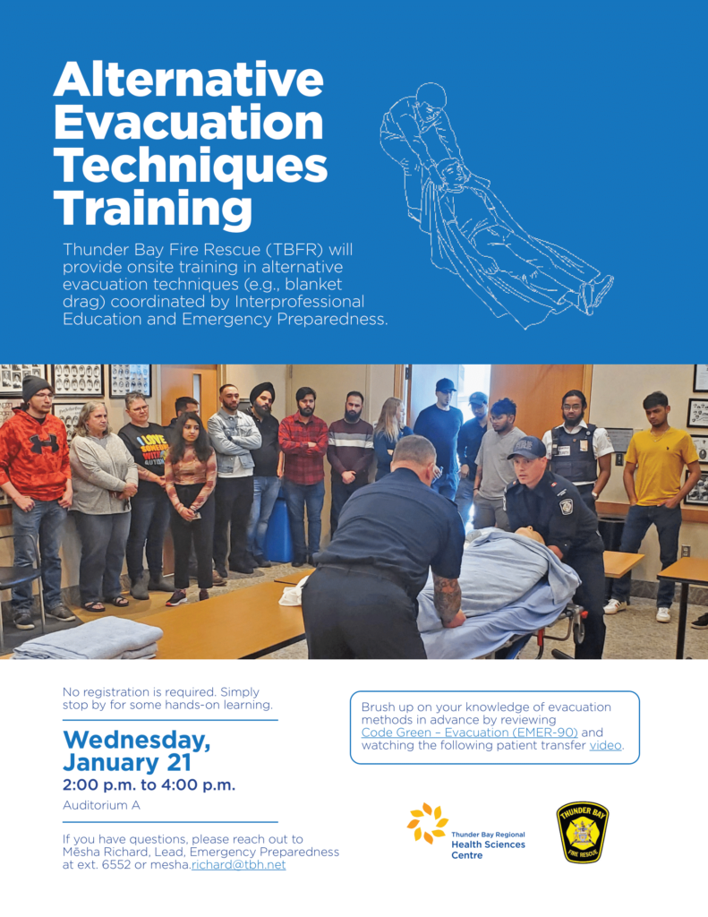 Thunder Bay Fire Rescue (TBFR) will provide onsite training in alternative evacuation techniques (e.g. blanket drag) coordinated by Interprofessional Education and Emergency Preparedness.