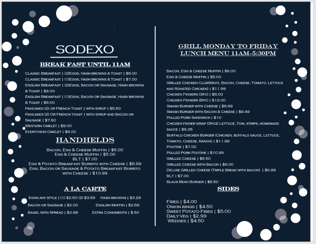 We are excited to share the updated 2026 menus for the Deli and Taco Bars, as well as the everyday grill offerings (see below). On top of these great choices we have our Sodexo To Go (STG) cooler, fully stocked with fresh sandwiches, salads, snacks, and sweet treats. We also carry a wide variety of candy and chocolate bars.