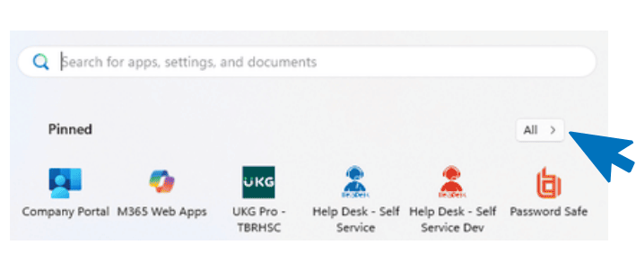 1. Click the Windows Start button. 2. Click All. 3. Locate the application in the list. 4. Right-click and select Pin to Start or More > Pin to taskbar