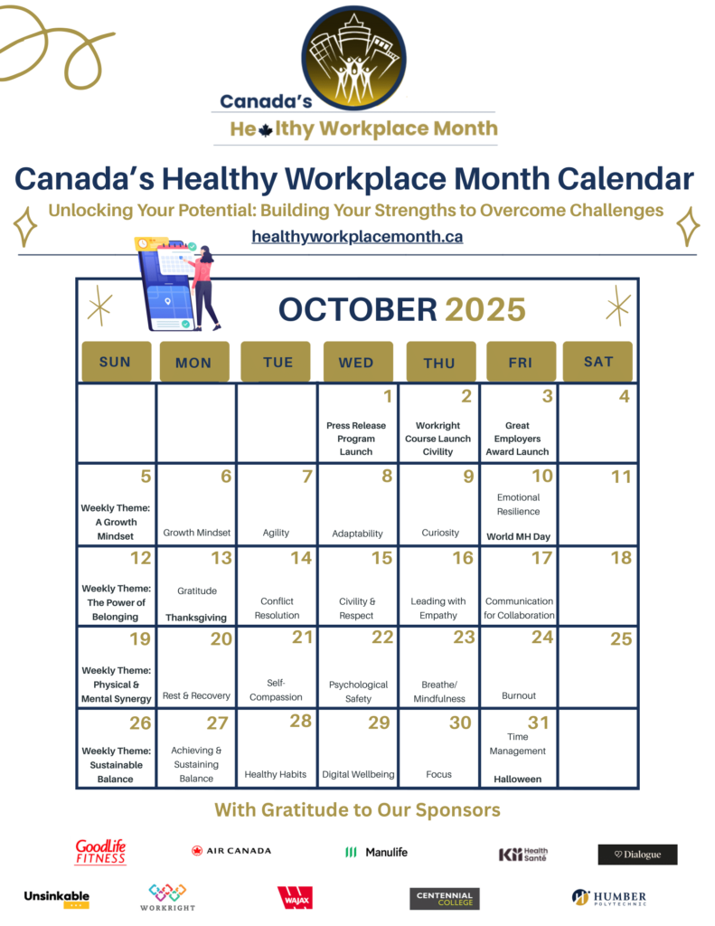 Canada’s Healthy Workplace Month (CHWM) is the annual celebration to inspire organizations across the country to create and sustain healthy workplaces. Led by Excellence Canada, every October for the past 25 years, employers have been encouraged to prioritize employee well-being by fostering environments that support physical, psychological, and social health.