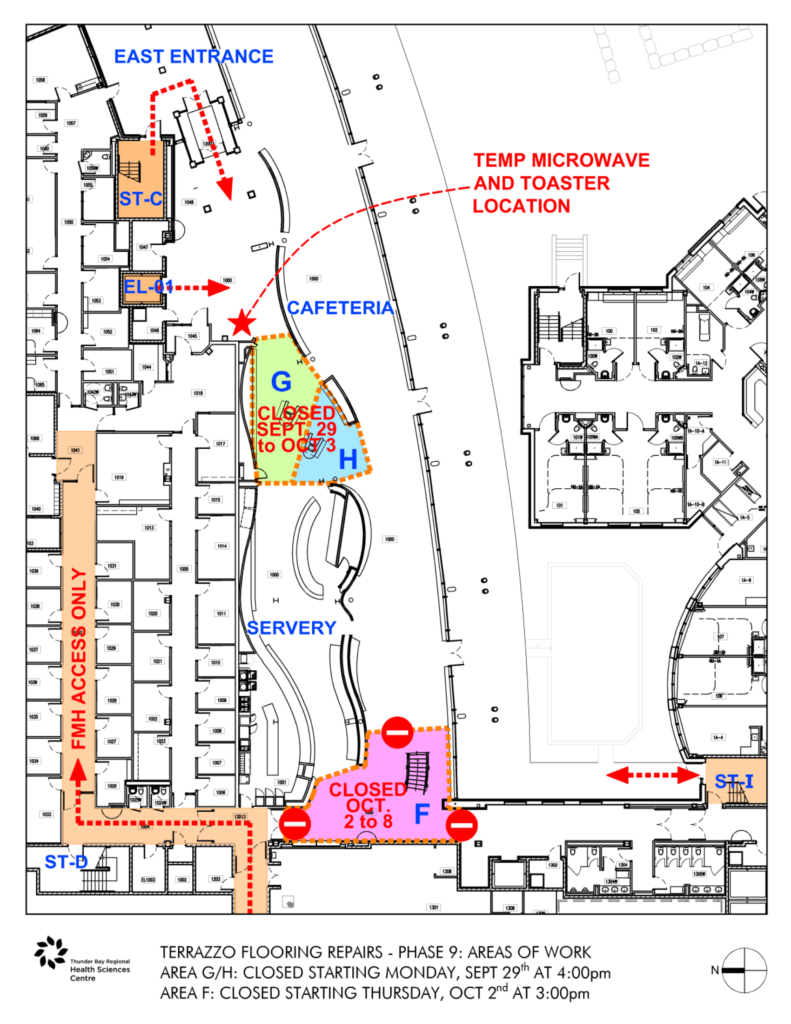 AREA F: October 2nd to 8th– WILL CLOSE OFF THE AREA AT THE BOTTOM OF THE GRAND STAIRCASE. This will close access through the corridor and to the Cafeteria on Level 1. – departments that would normally use this route for deliveries to Forensic Mental Health (FMH), e.g. N&FS, Pharmacy, Housekeeping, etc., should utilize the dishwash room corridor and enter FMH via Corridor 1032, OR, go upstairs to Level 2 then back down to Level 1 via Elevator-01 at the East Entrance.