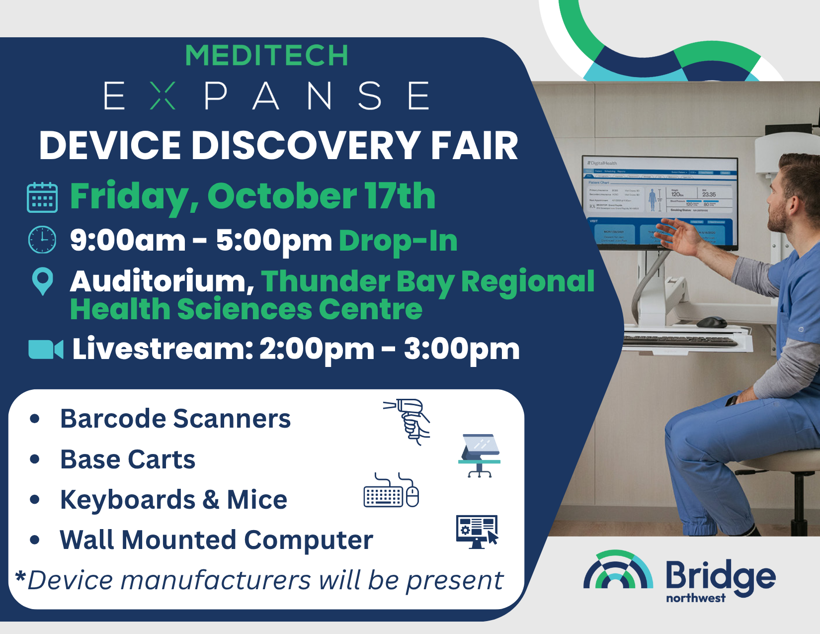 The Bridge Northwest Program is hosting a Device Discovery Fair at Thunder Bay Regional Health Sciences Centre that will allow staff and professional staff the opportunity to see, test, and compare the devices that will be used to access and document in the new Meditech Expanse system.