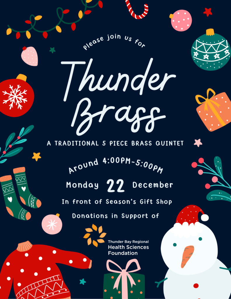 Thunder Brass will be performing onsite across from Season’s Gift Shop December 22, around 4:00 p.m., to play some holiday-themed music. They will be collecting donations for the Thunder Bay Regional Health Sciences Foundation.