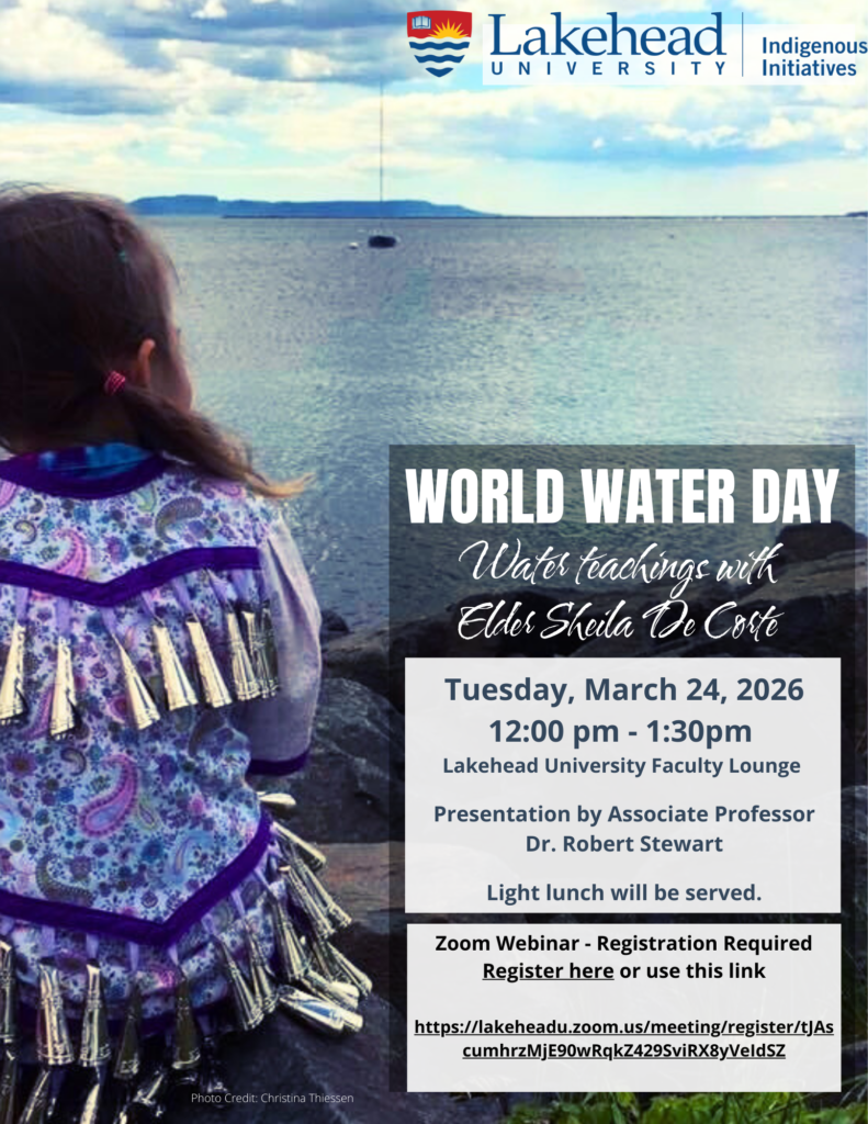 Lakehead University’s Office of Indigenous Initiatives invites you to join us to celebrate World Water Day on March 24, 2026 from 12:00 p.m. – 1:30 p.m. EST in the Faculty Lounge. This event will also be live-streamed for those that aren’t able to make it.