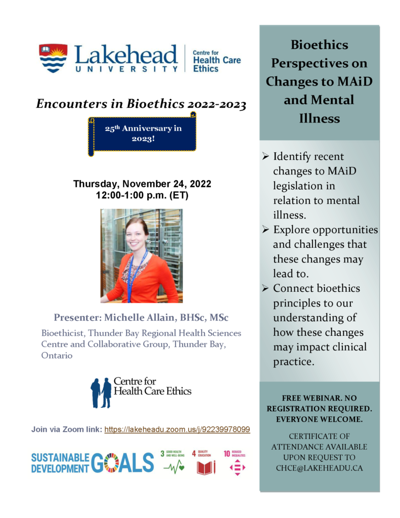 On Thursday, November 24, 2022 from 12:00 pm to 1:00 pm EST join Michelle Allain in this webinar to learn more about bioethics perspective on changes to MAiD and mental illness. Registration is not required, join at the appointed time via Zoom: https://lakeheadu.zoom.us/j/92239978099.
