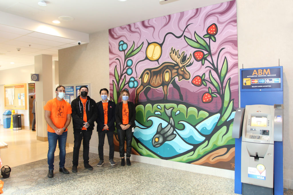 A large mural at the foot of the Grand Staircase was also unveiled today. Ojibwe artist Ryan Pooman (member of Fort William First Nation) was commissioned to create the ten foot by ten foot mural that welcomes patients, families, visitors and staff to the cafeteria. The bright, colourful image showcases traditional Indigenous foods from Northern Ontario. Stephanie Rowan, Manager, Nutrition and Food Services/GM Sodexo Retail noted, “We are incredibly fortunate to have Ryan’s artwork at the entrance of the cafeteria for everyone to enjoy. The only request we had was that the art tie in food somehow, and other than that, we left it up to him. The end result is amazing, he is an exceptionally talented artist.”