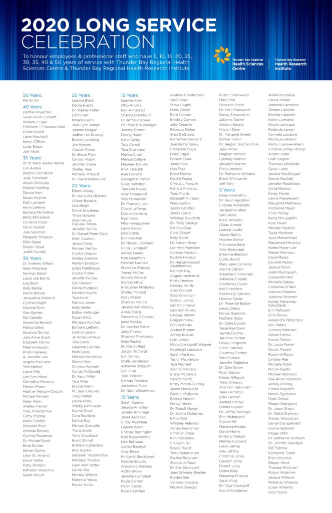 To honour employees & professional staff who have 5, 10, 15, 20, 25, 30, 35, 40 & 50 years of service with Thunder Bay Regional Health Sciences Centre & Thunder Bay Regional Health Research Institute.