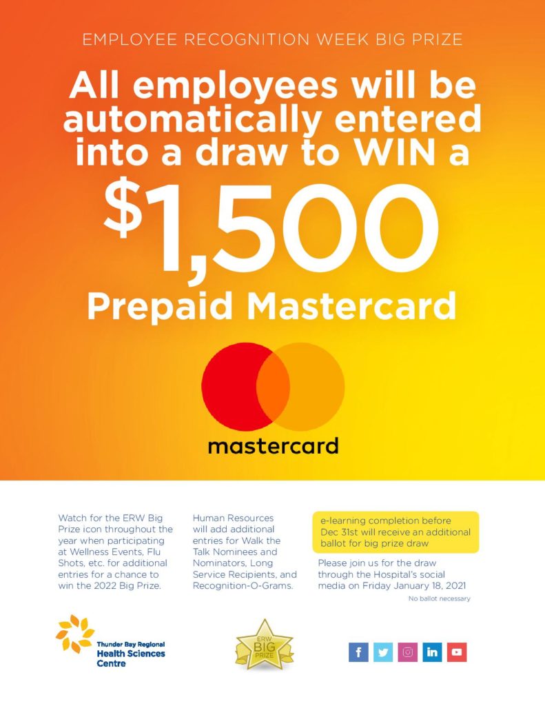 We’re thrilled to announce the winners of Friday’s Employee Recognition Week draws, which includes prizes generously donated by our Hospital’s local Affinity members, and the Big Prize of a $1,500 Prepaid Mastercard.