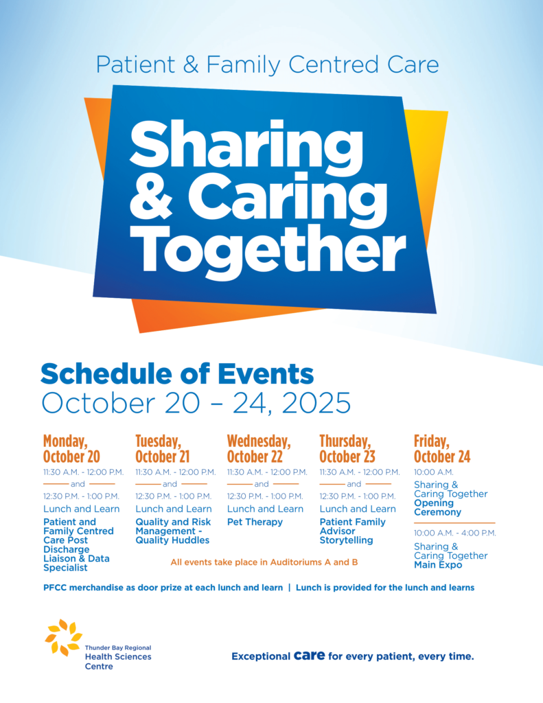 Thunder Bay Regional Health Sciences Centre (TBRHSC) is celebrating 16 years of Sharing and Caring Together, taking place from October 20 to 24. A collaboration between our Patient Family Advisors (PFAs) and Patient and Family Centred Care (PFCC) department, this week-long event celebrates the hard work and dedication to advancing the patient experience at TBRHSC.